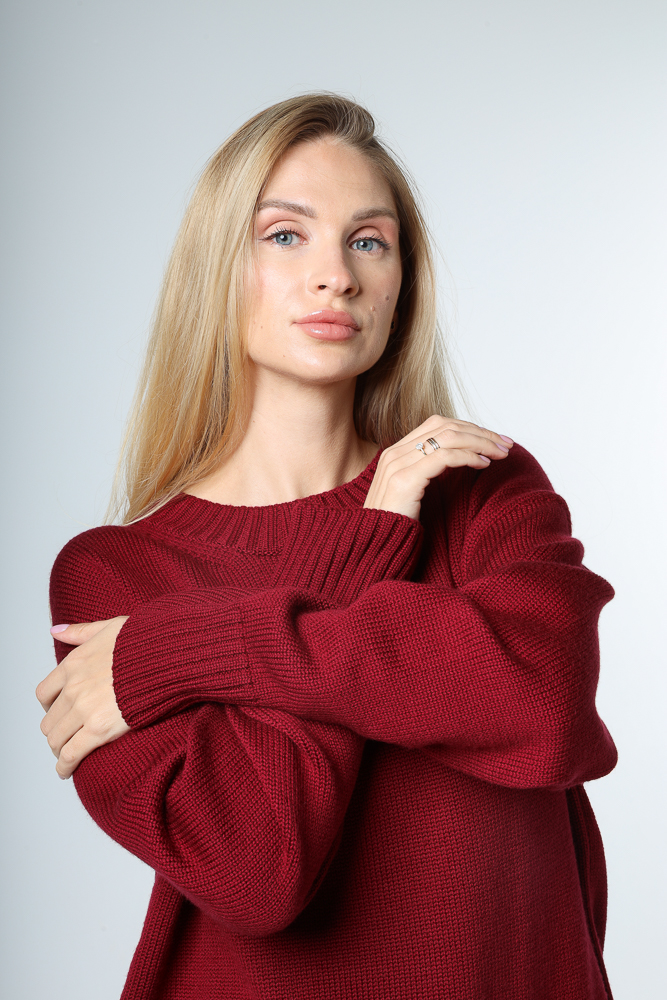 Modele ir 170 cm gara, XS izmērs un uzvilts džemperis ONE SIZE izmērs