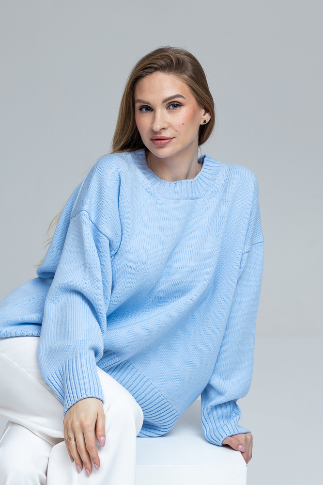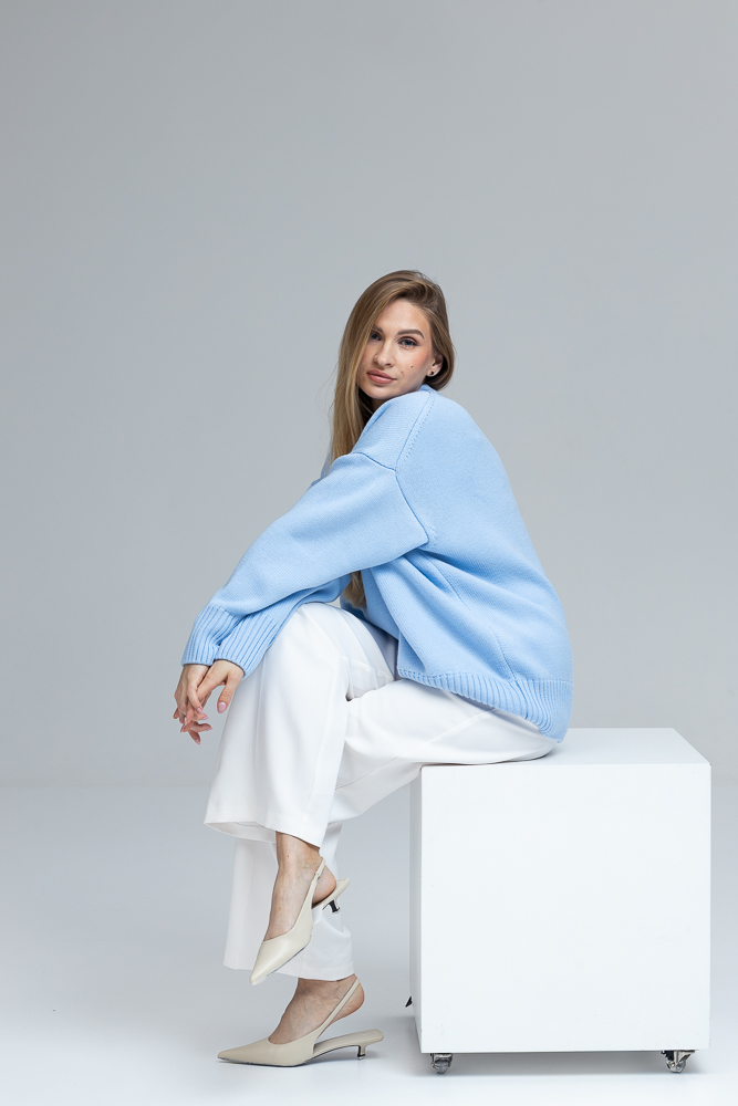 Modele ir 170 cm gara, XS izmērs un uzvilts džemperis ONE SIZE izmērs